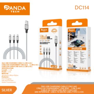 Panda Tech DC114 Cable 3 En 1 Micro+iOS+Tipo C 2.4A 1.2M Plata