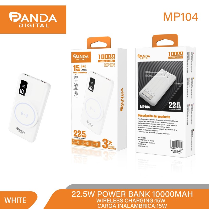 Panda Digital MP104 Batería Externa 10000mAh Portatil Con Cables Extraibles USB+iOS USB+Type-C USB+Micro 22.5W