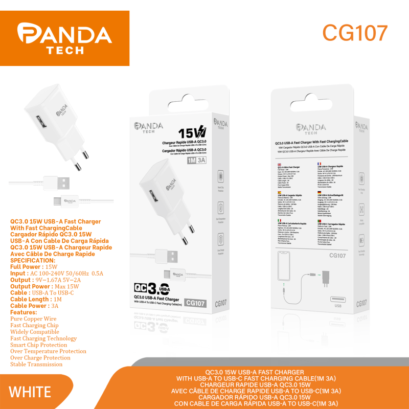 Panda Tech CG107 Cargador de USB QC3.0 15w con Cable Tipo C Blanco