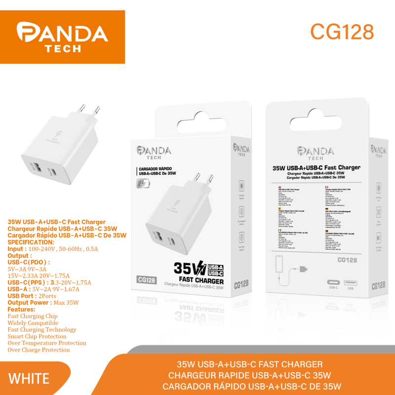 Panda Tech CG128 Cargador Rápido de Entrada Tipo C Y USB Blanco 35w