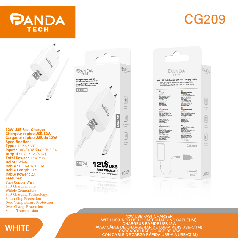 Panda Tech CG209 12W USB Cargador Rapido Con Cable De Carga Rapida USB-A a USB-C 1m